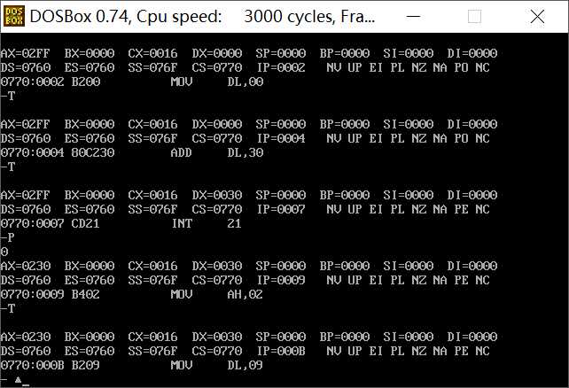 (2) 将 line4和line9种寄存器dl 的值分别修改为 0~9 中任何一个数字,重新汇编→ 连接→运行,观察结果的变化。