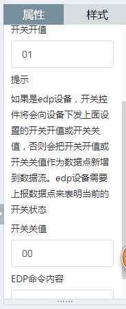 选择这个开关控件,然后在右面除了关联设备数据流之外,设置一下开关开值和开关关值:
