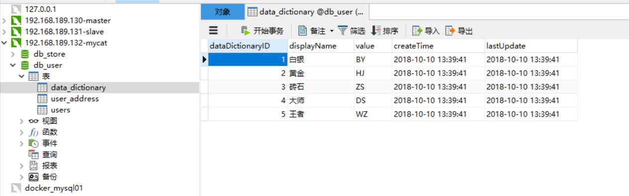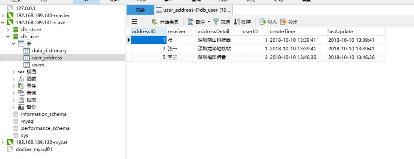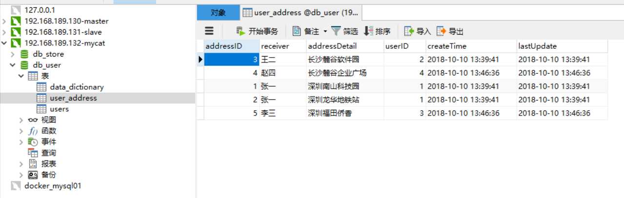 往mycat逻辑库db_user的逻辑表users插入数据,根据分片规则,userID取模,最后数据分别存在master db_user users和slave db_user users中
