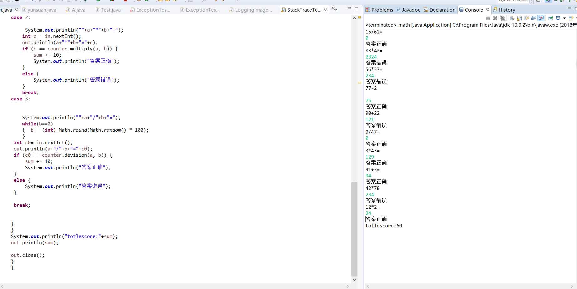 l 利用计算机类,设计一个小学生100以内数的四则运算练习程序,由计算机随机产生10道加减乘除练习题,学生输入答案,由程序检查答案是否正确,每道题正确计10分,错误不计分,10道题测试结束后给出测试总分;