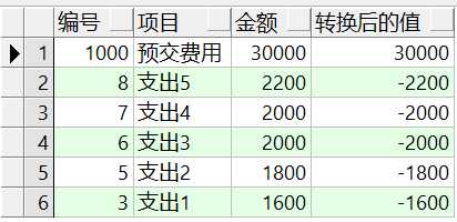 with x as (select rownum as seq,a.* from (select 编号,项目,金额 from detail order by 编号 desc) a ) select 编号,项目,金额,(case when seq = 1 then 金额 else -金额 end) as 转换后的值 from x;