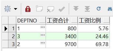 select deptno, 工资合计, round((工资合计/总合计)*100,2) as 工资比例 from ( select deptno,工资合计,sum(工资合计) over() as 总合计 from (select deptno,sum(sal) 工资合计 from emp group by deptno) x) y;