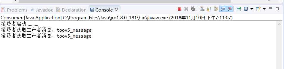 package com.toov5.Consumer; import java.io.IOException; import java.util.concurrent.TimeoutException; import com.rabbitmq.client.Channel; import com.rabbitmq.client.Connection; import com.rabbitmq.client.DefaultConsumer; import com.rabbitmq.client.Envelope; import com.rabbitmq.client.AMQP.BasicProperties; import com.toov5.utils.MQConnectionUtils; public class Consumer { //队列名称 private static final String QUEUE_NAME = "test_queue"; public static void main(String[] args) throws IOException, TimeoutException { System.out.println("消费者启动.........."); //创建新的连接 Connection connection = MQConnectionUtils.newConnection(); //创建Channel Channel channel = connection.createChannel(); // 消费者关联队列 channel.queueDeclare(QUEUE_NAME, false, false, false, null); DefaultConsumer defaultConsumerr = new DefaultConsumer(channel) { //监听获取消息 @Override public void handleDelivery(String consumerTag, Envelope envelope, BasicProperties properties, byte[] body) throws IOException { String msg =new String(body,"UTF-8"); System.out.println("消费者获取生产者消息:"+msg); } }; //牵手模式设置 默认自动应答模式 true:自动应答模式 channel.basicConsume(QUEUE_NAME, true, defaultConsumerr); // //关闭通道和连接 // channel.close(); // connection.close(); } }