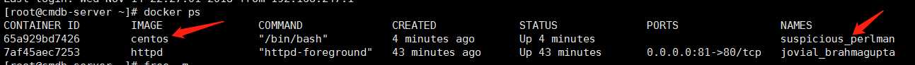 我们可以看到IMAGE为centos,suspicious_perlman是Docker随机分配的名字