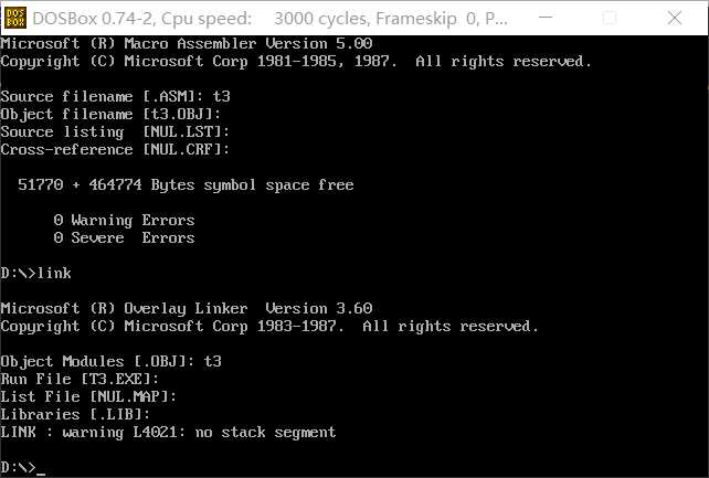 2.)汇编、链接无误后,灵活使用 debug 的 t 命令、g 命令、p 命令调试,用 d 命令 查看 0:200~0:23F,确认是否将 0~63 传送至此段内存区域