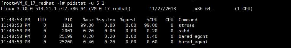 可以看到CPU使用率很高,pidstat查看具体占用CPU的进程,进程stress占的CPU达到99%,-u的含义为Report CPU utilization,5表示间隔5秒,1表示输出一组数据就停止,假如不加1,则会一直输出。