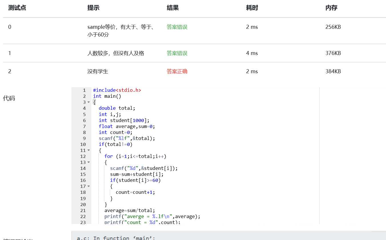 #include<stdio.h> int main() { double total; int i,j; int student[1000]; float average,sum=0; int count=0; scanf("%lf",&total); if(total!=0) { for (i=1;i<=total;i++) { scanf("%d",&student[i]); sum=sum+student[i]; if(student[i]>=60) { count=count+1; } } average=sum/total; printf("average = %.1lf\n",average); printf("count = %d",count); } else { printf("average = 0.0\n"); printf("count = 0"); } return 0;