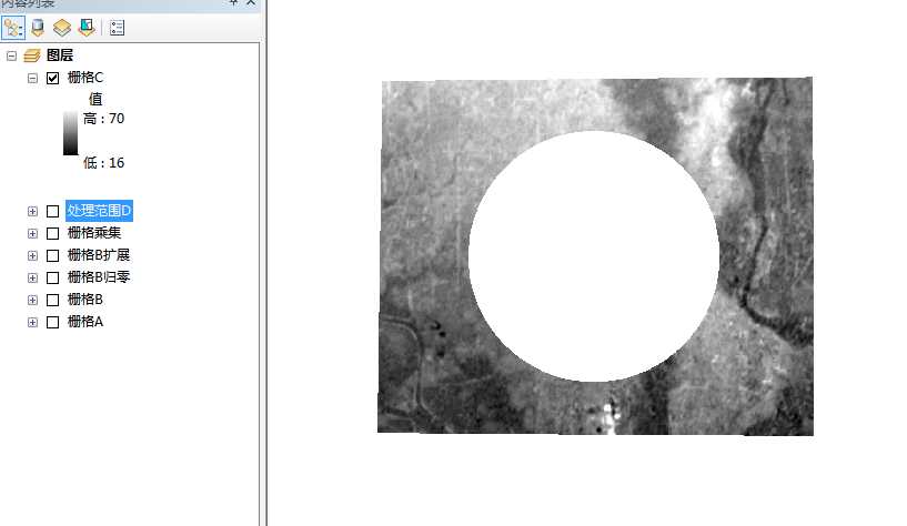 10 使用栅格计算器,筛选栅格值大于0的区域,就得到最终的结果,即栅格C。