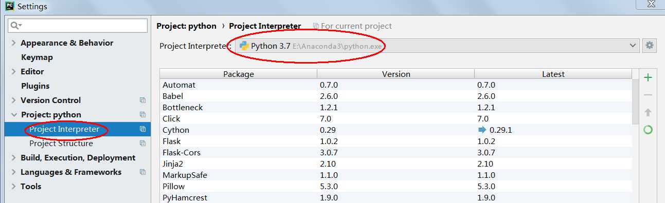 左上角选择File→Settings→Project Interpreter,右侧选择Anaconda安装路径下的python.exe即可