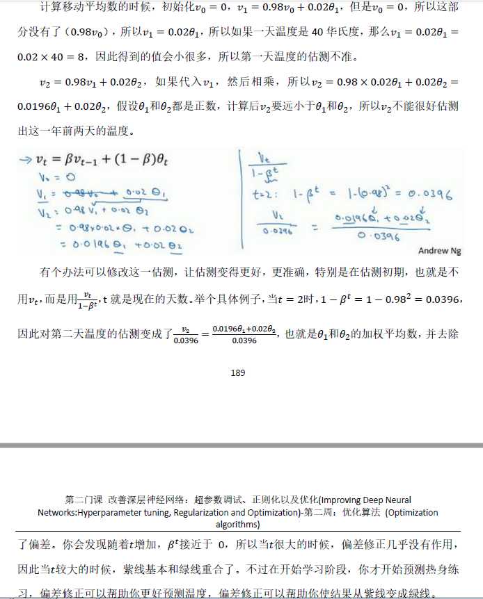 在计算时可视Vt 大概是1/(1-B)的每日温度,如果B是0.9,那么就是十天的平均值,当B较大时, 指数加权平均值适应更缓慢