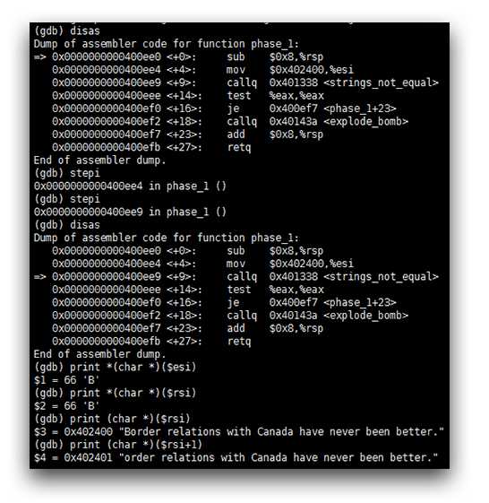 0000000000400ee0 <phase_1>: 400ee0: 48 83 ec 08 sub $0x8,%rsp 400ee4: be 00 24 40 00 mov $0x402400,%esi 400ee9: e8 4a 04 00 00 callq 401338 <strings_not_equal> 400eee: 85 c0 test %eax,%eax 400ef0: 74 05 je 400ef7 <phase_1+0x17> 400ef2: e8 43 05 00 00 callq 40143a <explode_bomb> 400ef7: 48 83 c4 08 add $0x8,%rsp 400efb: c3 retq