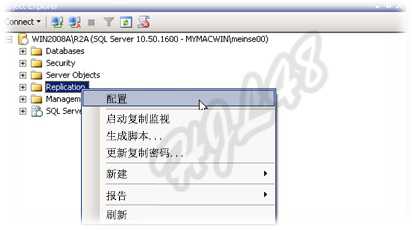 连接到服务器后,右键单击服务器下的“Replication”文件夹,然后选择“Configure Distribution ...”,如图1所示。