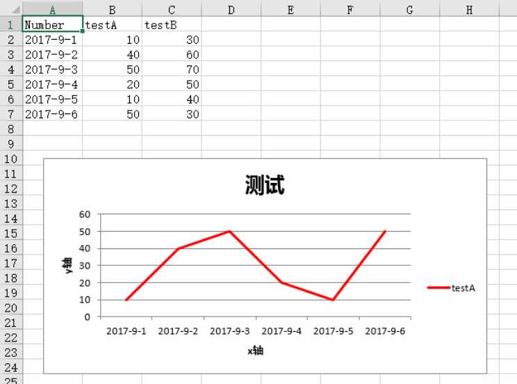 1 import xlsxwriter #导入模块 2 3 workbook = xlsxwriter.Workbook(‘new_excel.xlsx‘) #创建新的excel 4 5 worksheet = workbook.add_worksheet(‘sheet1‘) #创建新的sheet 6 7 headings = [‘Number‘,‘testA‘,‘testB‘] #创建表头 8 9 data = [ 10 [‘2017-9-1‘,‘2017-9-2‘,‘2017-9-3‘,‘2017-9-4‘,‘2017-9-5‘,‘2017-9-6‘], 11 [10,40,50,20,10,50], 12 [30,60,70,50,40,30], 13 ] #自己造的数据 14 15 worksheet.write_row(‘A1‘,headings) 16 17 worksheet.write_column(‘A2‘,data[0]) 18 worksheet.write_column(‘B2‘,data[1]) 19 worksheet.write_column(‘C2‘,data[2]) #将数据插入到表格中 20 21 chart_col = workbook.add_chart({‘type‘:‘line‘}) #新建图表格式 line为折线图 22 chart_col.add_series( #给图表设置格式,填充内容 23 { 24 ‘name‘:‘=sheet1!$B$1‘, # 这个地方的 sheet1 是指 具体创建sheet的名字 25 ‘categories‘:‘=sheet1!$A$2:$A$7‘, # X轴的坐标值取值地址 26 ‘values‘: ‘=sheet1!$B$2:$B$7‘, # Y轴的坐标值取值地址 27 ‘line‘: {‘color‘: ‘red‘}, 28 } 29 ) 30 31 chart_col.set_title({‘name‘:‘测试‘}) 32 chart_col.set_x_axis({‘name‘:"x轴"}) 33 chart_col.set_y_axis({‘name‘:‘y轴‘}) #设置图表表头及坐标轴 34 35 chart_col.set_style(1) 36 37 worksheet.insert_chart(‘A10‘,chart_col,{‘x_offset‘:25,‘y_offset‘:10}) #放置图表位置 38 39 workbook.close()