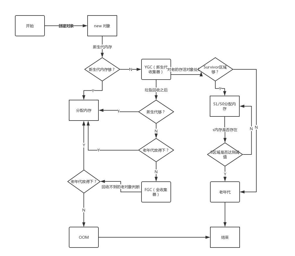 本篇内容主要写的是对象的分配,所以,理论上只跟“堆”有关系, 结合上面的思维导图,说一下,当用户new Object的时候,jvm会把这个对象放入堆里面,并把对象的引用存入栈里面,创建对象之后,自然下一步就是为对象分配内存咯, 堆内存分为“新生代”(eden)和老年代(old),新new出来的对象会被存放在eden区,当eden区域放不下的时候,设计jvm的工程师会想,eden区的对象这么多都不用了, 能不能把不用的对象给它回收掉呢? 接下来就很牵强得扯到了 jvm的eden区的回收(Young Garbage Collection 下面简称 YGC)。