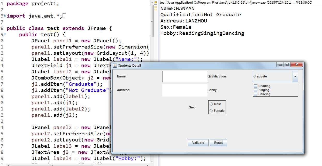 1 package project1; 2 3 import java.awt.*; 4 import java.awt.event.*; 5 import javax.swing.*; 6 import javax.swing.border.*; 7 8 public class test extends JFrame { 9 public test() { 10 JPanel panel1 = new JPanel(); 11 panel1.setPreferredSize(new Dimension(700, 45)); 12 panel1.setLayout(new GridLayout(1, 4)); 13 JLabel label1 = new JLabel("Name:"); 14 JTextField j1 = new JTextField(""); 15 JLabel label2 = new JLabel("Qualification:"); 16 JComboBox<Object> j2 = new JComboBox<>(); 17 j2.addItem("Graduate"); 18 j2.addItem("Not Graduate"); 19 panel1.add(label1); 20 panel1.add(j1); 21 panel1.add(label2); 22 panel1.add(j2); 23 24 JPanel panel2 = new JPanel(); 25 panel2.setPreferredSize(new Dimension(700, 50)); 26 panel2.setLayout(new GridLayout(1, 4)); 27 JLabel label3 = new JLabel("Address:"); 28 JTextArea j3 = new JTextArea(); 29 JLabel label4 = new JLabel("Hobby:"); 30 JPanel p = new JPanel(); 31 p.setLayout(new GridLayout(3, 1)); 32 p.setBorder(BorderFactory.createLineBorder(null)); 33 JCheckBox c1 = new JCheckBox("Reading"); 34 JCheckBox c2 = new JCheckBox("Singing"); 35 JCheckBox c3 = new JCheckBox("Dancing"); 36 p.add(c1); 37 p.add(c2); 38 p.add(c3); 39 panel2.add(label3); 40 panel2.add(j3); 41 panel2.add(label4); 42 panel2.add(p); 43 44 JPanel panel3 = new JPanel(); 45 panel3.setPreferredSize(new Dimension(700, 150)); 46 FlowLayout flowLayout1 = new FlowLayout(FlowLayout.CENTER, 50, 10); 47 panel3.setLayout(flowLayout1); 48 JLabel label5 = new JLabel("Sex:"); 49 JPanel p1 = new JPanel(); 50 p1.setLayout(new GridLayout(2, 1)); 51 p1.setBorder(BorderFactory.createLineBorder(null)); 52 ButtonGroup bu = new ButtonGroup(); 53 JRadioButton jr1 = new JRadioButton("Male"); 54 JRadioButton jr2 = new JRadioButton("Female"); 55 bu.add(jr1); 56 bu.add(jr2); 57 p1.add(jr1); 58 p1.add(jr2); 59 panel3.add(label5); 60 panel3.add(p1); 61 add(panel1); 62 add(panel2); 63 add(panel3); 64 65 JPanel panel4 = new JPanel(); 66 panel4.setPreferredSize(new Dimension(700, 150)); 67 JButton b1 = new JButton("Validate"); 68 panel4.add(b1); 69 JButton b2 = new JButton("Reset"); 70 panel4.add(b2); 71 add(panel4); 72 73 FlowLayout flowLayout = new FlowLayout(); 74 this.setLayout(flowLayout); 75 this.setTitle("Students Detail"); 76 this.setBounds(200, 200, 800, 400); 77 this.setVisible(true); 78 this.setDefaultCloseOperation(DISPOSE_ON_CLOSE); 79 80 b1.addActionListener(new ActionListener() { 81 82 @Override 83 public void actionPerformed(ActionEvent e) { 84 String xueli = j2.getSelectedItem().toString(); 85 System.out.println("Name:" + j1.getText()); 86 System.out.println("Qualification:" + xueli); 87 String hobbystring = "Hobby:"; 88 if (c1.isSelected()) { 89 hobbystring += "Reading"; 90 } 91 if (c2.isSelected()) { 92 hobbystring += "Singing"; 93 } 94 if (c3.isSelected()) { 95 hobbystring += "Dancing"; 96 } 97 System.out.println("Address:" + j3.getText()); 98 if (jr1.isSelected()) { 99 System.out.println("Sex:Male"); 100 } 101 if (jr2.isSelected()) { 102 System.out.println("Sex:Female"); 103 } 104 System.out.println(hobbystring); 105 } 106 }); 107 b2.addActionListener(new ActionListener() { 108 109 @Override 110 public void actionPerformed(ActionEvent e) { 111 j1.setText(null); 112 j3.setText(null); 113 j2.setSelectedIndex(0); 114 c1.setSelected(false); 115 c2.setSelected(false); 116 c3.setSelected(false); 117 bu.clearSelection(); 118 } 119 }); 120 } 121 122 public static void main(String args[]) { 123 new test(); 124 } 125 126 }