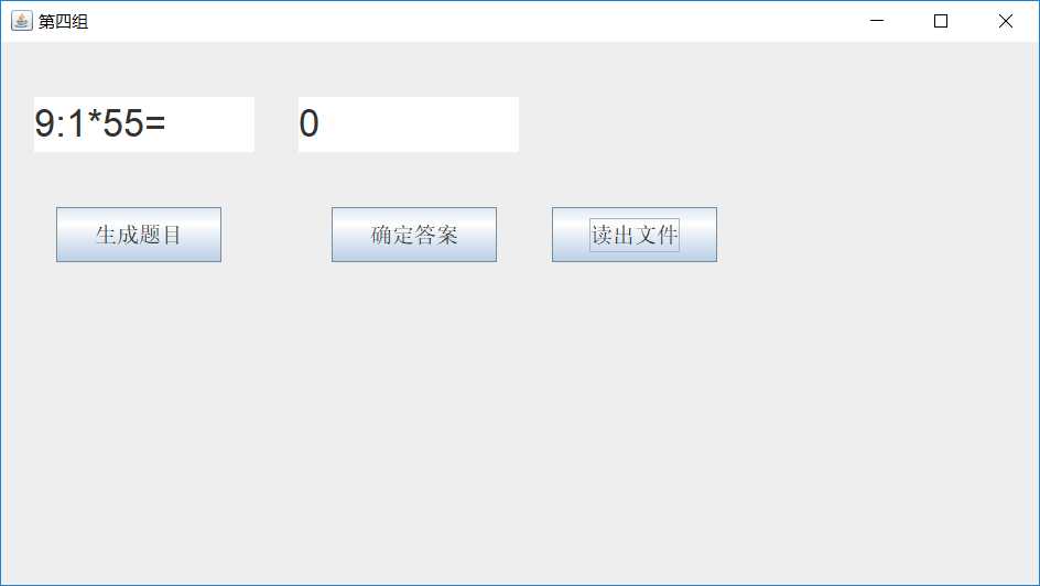 import java.util.Scanner; import java.io.FileNotFoundException; import java.io.PrintWriter; import java.util.Random; public class Demo { public static void main(String[] args) { Scanner in = new Scanner(System.in); Number counter = new Number(); PrintWriter out = null; try { out = new PrintWriter("text.txt"); } catch (FileNotFoundException e) { // TODO Auto-generated catch block e.printStackTrace(); } int sum = 0; for (int i = 1; i <= 10; i++) { int a = (int) Math.round(Math.random() * 100); int b = (int) Math.round(Math.random() * 100); int m = (int) Math.round(Math.random() * 3); Random n = new Random(); switch (m) { case 0: System.out.println(i + ": " + a + "/" + b + "="); while (b == 0) { b = (int) Math.round(Math.random() * 100); } int c = in.nextInt(); out.println(a + "/" + b + "=" + c); if (c == counter.division(a, b)) { sum += 10; System.out.println("恭喜答案正确"); } else { System.out.println("抱歉,答案错误"); } break; case 1: System.out.println(i + ": " + a + "*" + b + "="); int c1 = in.nextInt(); out.println(a + "*" + b + "=" + c1); if (c1 == counter.multiplication(a, b)) { sum += 10; System.out.println("恭喜答案正确"); } else { System.out.println("抱歉,答案错误"); } break; case 2: System.out.println(i + ": " + a + "+" + b + "="); int c2 = in.nextInt(); out.println(a + "+" + b + "=" + c2); if (c2 == counter.add(a, b)) { sum += 10; System.out.println("恭喜答案正确"); } else { System.out.println("抱歉,答案错误"); } break; case 3: System.out.println(i + ": " + a + "-" + b + "="); int c3 = in.nextInt(); out.println(a + "-" + b + "=" + c3); if (c3 == counter.reduce(a, b)) { sum += 10; System.out.println("恭喜答案正确"); } else { System.out.println("抱歉,答案错误"); } break; } } System.out.println("成绩" + sum); out.println("成绩:" + sum); out.close(); } }
