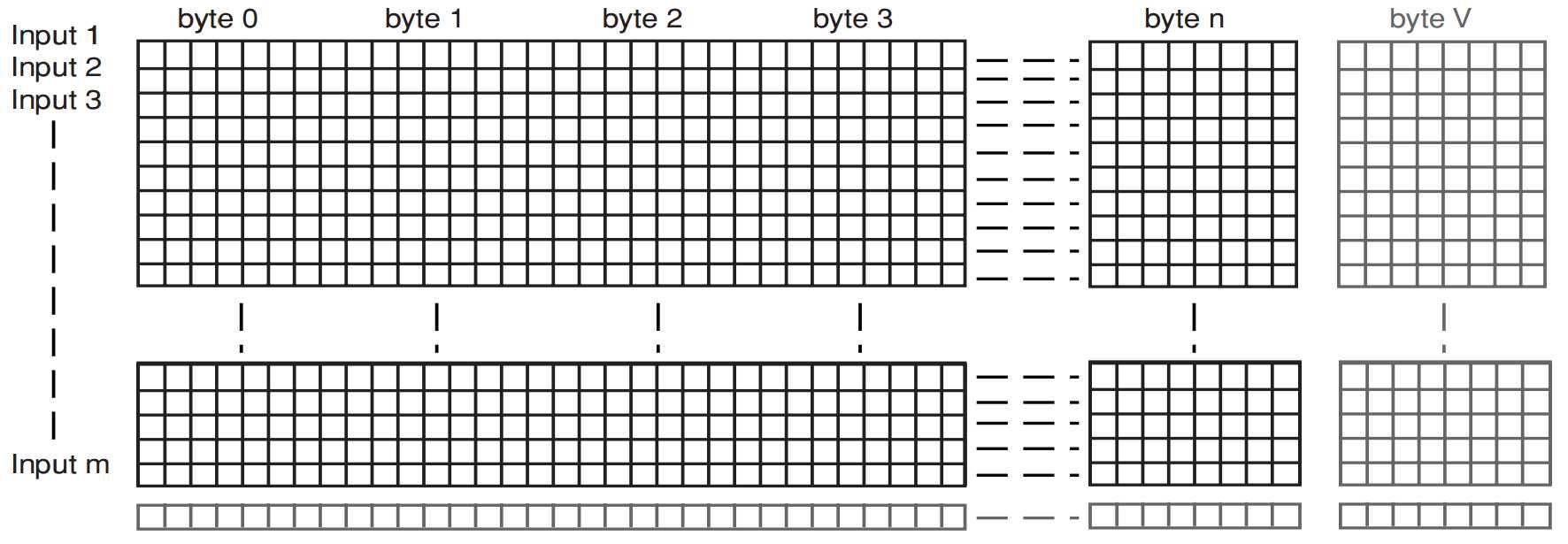 考虑一个待传输的数据块,其大小为NxR字节,分为R行,每行N字节。现在给矩阵的每一行附加额外的一个字节,并给矩阵附加额外的一行。这些地方就是额外的位置。