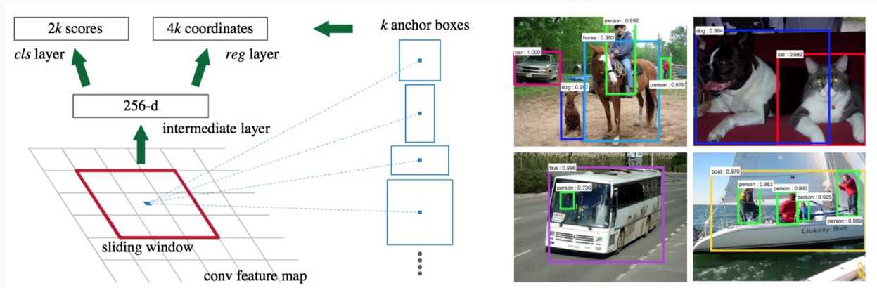区域提议网络(RPN)以任意大小的图像作为输入,输出一组矩形的候选区域,并且给每个候选区域打上一个分数。如下图