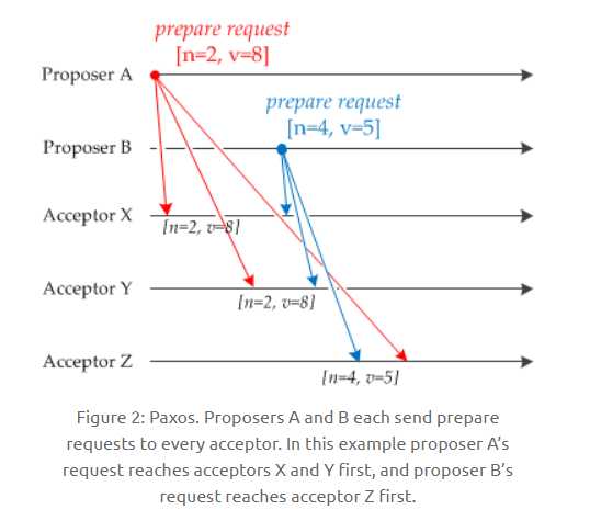 如下图,Acceptor Z 收到 Proposer A 发来的 [n=2, v=8] 的提议请求,由于之前已经接收过 [n=4, v=5] 的提议,并且 n > 2,因此就抛弃该提议请求;Acceptor X 收到 Proposer B 发来的 [n=4, v=5] 的提议请求,因为之前接收到的提议为 [n=2, v=8],并且 2 <= 4,因此就发送 [n=2, v=8] 的提议响应,设置当前接收到的提议为 [n=4, v=5],并且保证以后不会再接受序号小于 4 的提议。Acceptor Y 类似。
