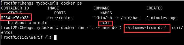 命令:docker run -it --name dc02 --volumes-from dc01 ccrr/centos