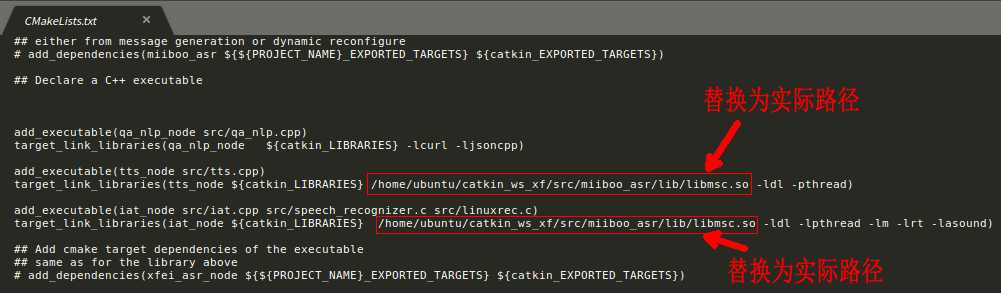 了解了miiboo_asr功能包的基本情况后,我们就开始编译安装吧。首先,将miiboo_asr包拷贝到~/catkin_ws_apps/src/目录下。然后将上面申请到的树莓派3平台对应的Linux SDK库libmsc.so文件拷贝到miiboo_asr/lib/中,并将miiboo_asr/CMakeLists.txt文件中有关libmsc.so的路径替换为你存放该libmsc.so的实际路径。如图12。