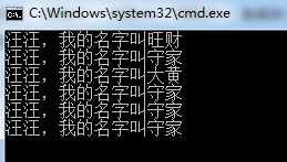 class dog { public string name; public int HP = 100; public void bark() //实现一个说话的方法 { Console.WriteLine("汪汪,我有个好听的名字叫:{0}", this.name); } public void bite(dog dg, int blood) //实现一个咬的方法 { Console.WriteLine("{0}开始攻击{1}", name, dg.name); dg.HP -= blood; //另一个狗血量减10 Console.WriteLine(name + "的血量:" + HP + dg.name + "的血量:" + dg.HP); } } static void Main(string[] args) { //实例化一个狗的类 dog a = new dog(); dog b = new dog(); a.name = "旺财"; b.name = "来福"; a.bark(); //重载狗咬狗的函数 a.bite(b,10); b.bark(); b.bite(a, 10); Console.ReadKey(); }