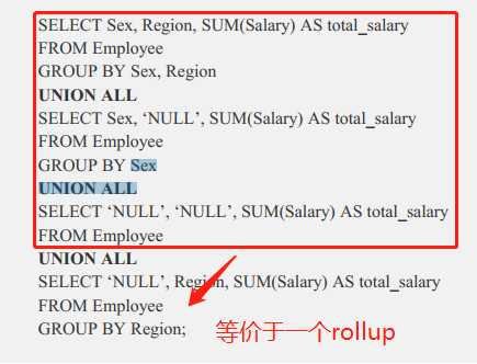 --4、Rollup SELECT department,name,sum(salary)AS sum FROM employee_part GROUP BY Rollup(department,name); 等价于 SELECT department,name,sum(salary)AS sum FROM employee_part GROUP BY department,name union SELECT department,‘NULL‘,SUM(salary)AS sum FROM employee_part GROUP BY department union SELECT ‘NULL‘,‘NULL‘,SUM(salary)AS sum FROM employee_part;
