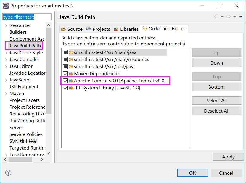 1. 右键项目点击properties,找到Java Build Path 中Order and Export 检查Tomcat是否勾选