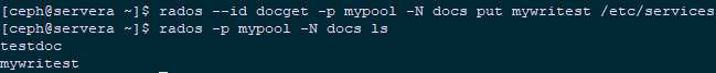 1 [ceph@servera ~]$ rados --id docget -p mypool -N docs put mywritest /etc/services