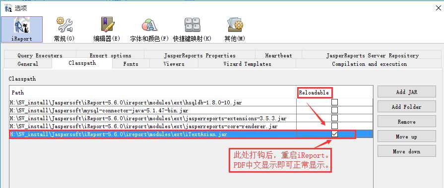 添加完 iTextAsian.jar 后,在 Reloadable列 将其勾选,重启iReport 5.6.0,PDF中文即可正常显示。