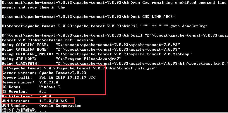 在Tomcat/bin下,双击version.bat脚本可查看详细信息,但是由于默认脚本不显示运行过程,故需要修改下DOS脚本