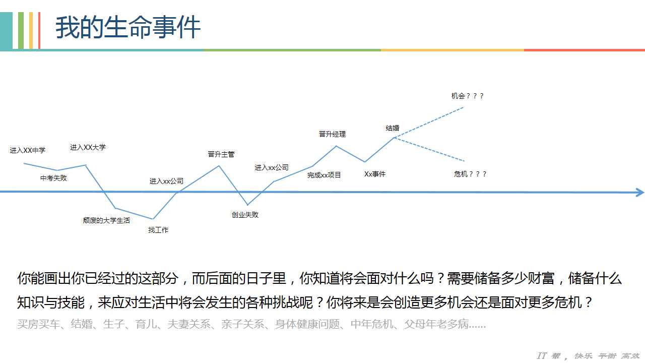 从生命线中我们可以看到自己所经历过的,起起浮浮的事情,清晰的知道那些事情影响了自己人生的走向,又是哪些决定哪些选择,造就了现在的自己。以史为镜,可以知兴替,以人为镜,可以明得失。我们可以从自己以及别人的经历中总结出更好的经验指导自己工作与生活中所面对的选择。