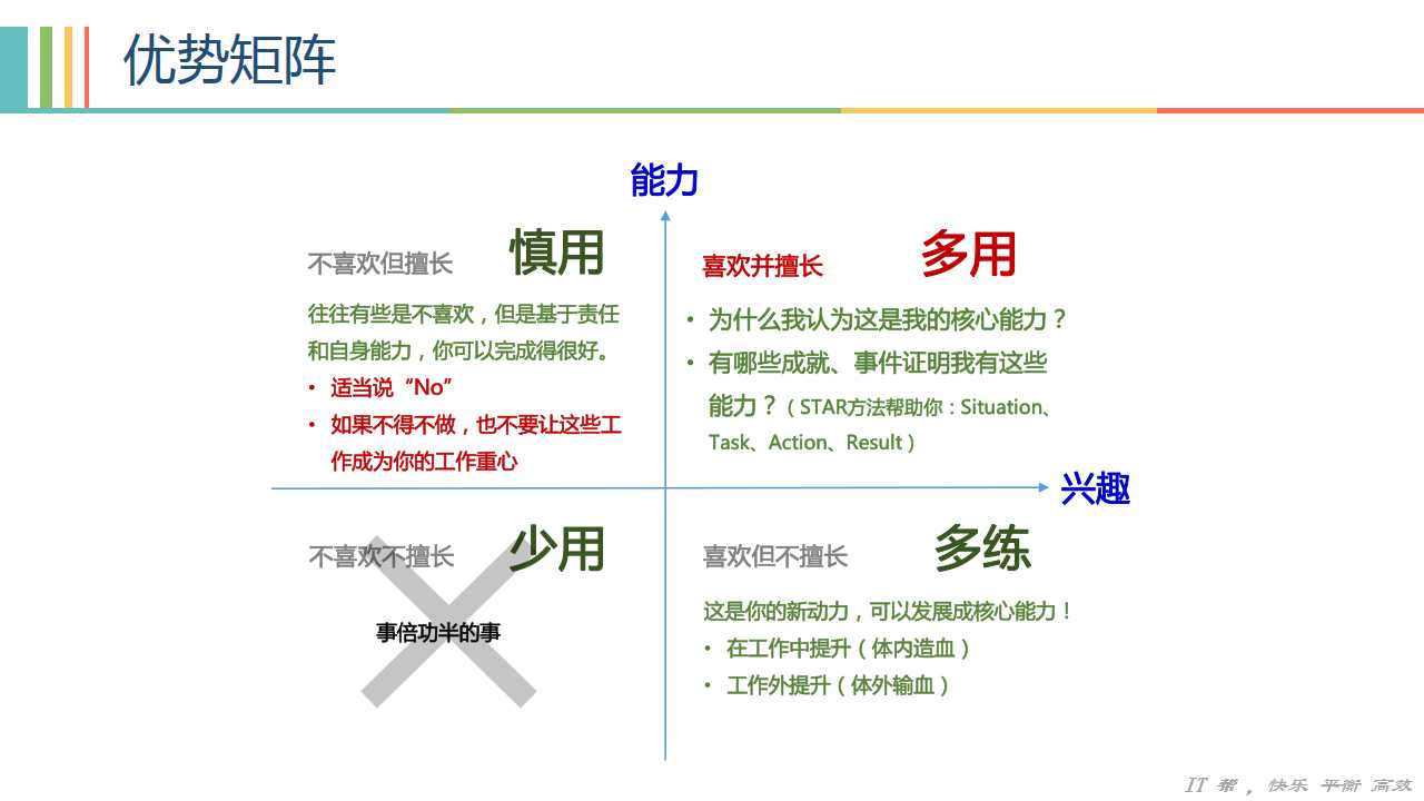 对于职业优势来说,也是同样的道理,我们要多去寻找那些可以帮助我们成长的,感兴趣的,完成后让自己有成就感的事情。反复的去做这些事情,会让我们得到很多正面的反馈,让我们“玩上瘾”,在这个过程中经验就会不断的积累起来,直到成为某个领域的专家。