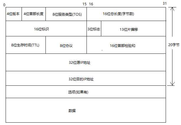 IP数据报的格式如下,普通的IP首部长为20个字节,除非含有选项字段。