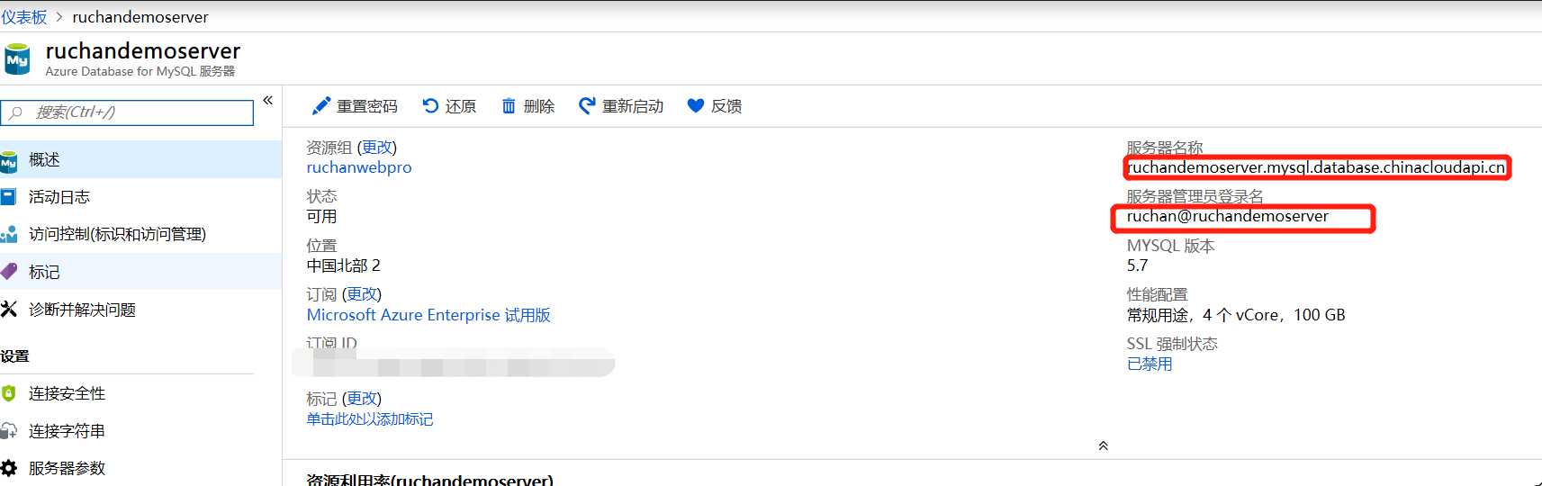 创建完成后查看服务器信息,记下服务器名称和管理员登录名。