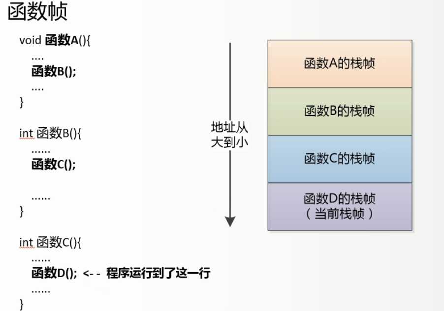 每个函数都有栈帧,里面存放上一个栈帧的地址,输入参数,返回值等