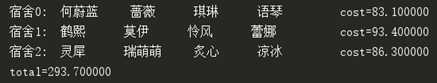 def random_optimize(): ‘‘‘ 随机法 :return: 最佳方案,方案的总成本,方案中每个宿舍的成本 ‘‘‘ n = len(STUDENTS_NAME) best = None # 最佳方案 best_total_cost, best_droms_cost = 9999999, [] # 最佳方案的宿舍成本和总成本 # 随机分配1000次 for t in range(1000): solution = [] stu_list = base_data.upset() # 将学生分配到宿舍中 for i in range(0, n, NUM_PER_DROM): solution.append(stu_list[i:i + NUM_PER_DROM]) total_cost, droms_cost = cost_fun(solution) # 计算该方案的成本 if total_cost < best_total_cost: best = solution best_total_cost, best_droms_cost = total_cost, droms_cost return best, best_total_cost, best_droms_cost best, best_total_cost, best_droms_cost = random_optimize() display(best, best_total_cost, best_droms_cost)