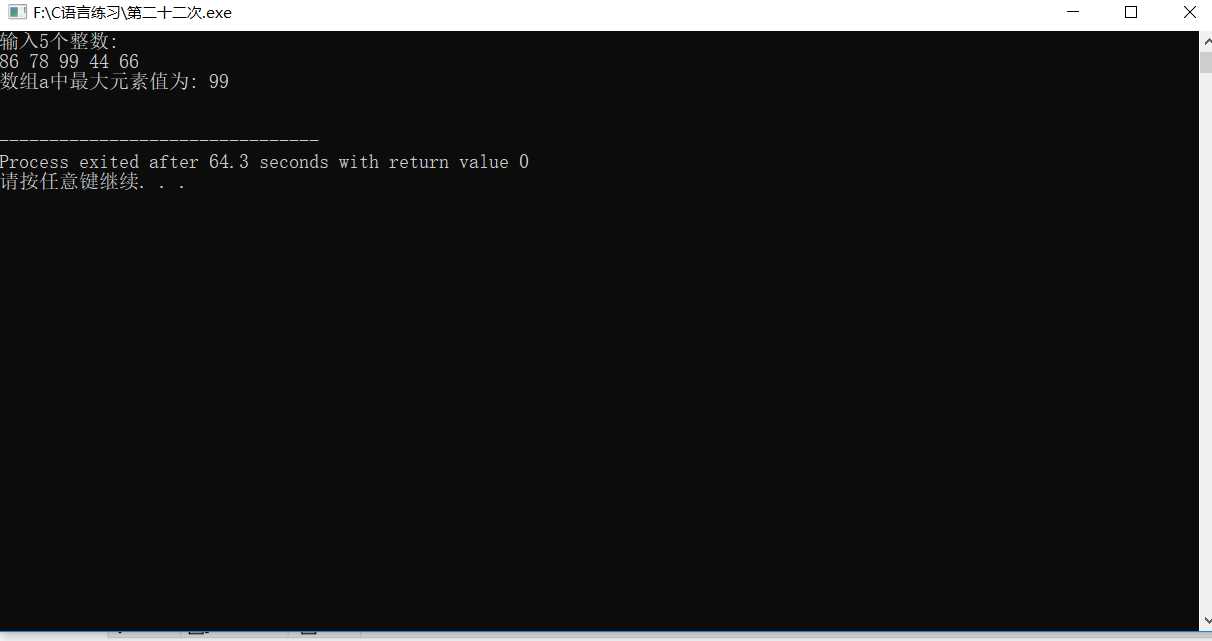 #include <stdio.h> int findMax(int a[], int n); const int N=5; int main() { int a[N]; int max, i; printf("输入%d个整数: \n", N); for(i=0;i<N;i++) scanf("%d",&a[i]); max=findMax(a,N); printf("数组a中最大元素值为: %d\n\n", max); return 0; } int findMax(int a[],int n){ int i,max; max=a[0]; for(i=0;i<N;i++){ if(a[i]>max) max=a[i]; } return max; }