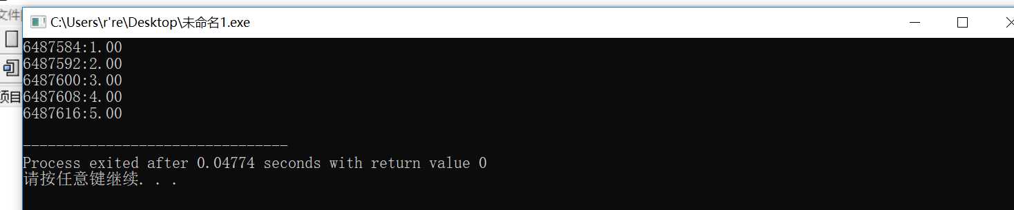 #include<stdio.h> const int N=5; int main(){ double a[5]={1.0,2.0,3.0,4.0,5.0}; int i; for(i=0;i<N;i++) printf("%d:%.2f\n",&a[i],a[i]); return 0; }