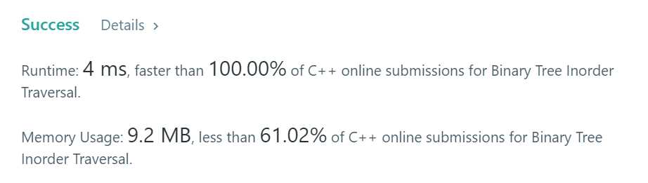 /** * Definition for a binary tree node. * struct TreeNode { * int val; * TreeNode *left; * TreeNode *right; * TreeNode(int x) : val(x), left(NULL), right(NULL) {} * }; */ class Solution { public: vector<int> inorderTraversal(TreeNode* root) { vector<int> ans; stack<TreeNode*> temp; while( root || !temp.empty()) { while(root) { temp.push(root); root = root->left; } if(!temp.empty()) { root = temp.top(); temp.pop(); ans.push_back(root->val); root = root->right; } } return ans; } };