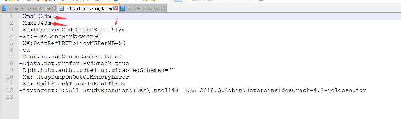 打开IDEA的安装路径,进入bin目录下,用记事本或文本编辑器打开下图中箭头所指的文件