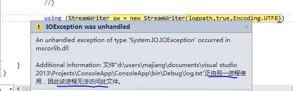 using (StreamWriter sw = new StreamWriter(logpath,true,Encoding.UTF8))