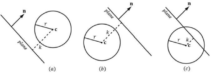 所以截头锥体的检测修改为和6个平面的检测,如下图所示:令球体有中心点c和半径r。那么从中心点到平面的距离为k = n · c + d