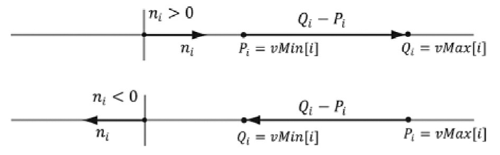 上面的代码可以从一维的方式查看,选择Pi和Qi然后Qi ? Pi和法向量有一个相同的方向: