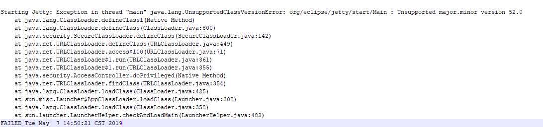 Starting Jetty: Exception in thread "main" java.lang.UnsupportedClassVersionError: org/eclipse/jetty/start/Main : Unsupported major.minor version 52.0