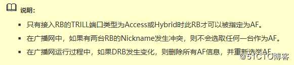 被指定用来转发流量的RB,只有AF可以作为Ingress和Egress,非AF只能作为Transit RB,即当服务器采用双上行接入TRILL网络时,如果服务器网卡不采用负载分担的方式接入,很容易产生环路。所以需要指定一台RB作为转发用户流量的RB。