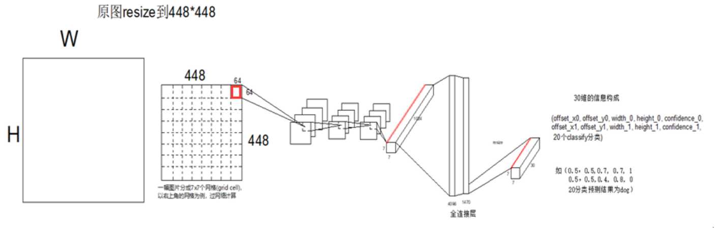 测试图片resize之后,进入backbone,产生1个7*7*1024的feature map, 这个上面的一共有49个1*1*1024的tensor,每1个tensor对应resized image上面一个区域。将这个feature map过全连接,输出7*7*30的output,每个1*1*30的tensor,就对应resized image上面1个grid cell