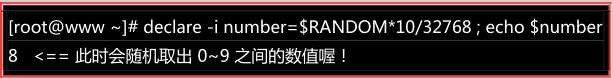 这个玩意儿就是『随机随机数』的发量啦!目前大多数的 distributions 都会有随机数生成器,那就是 /dev/random 这个档案。 我们可以透过这个随机数档案相关的变量 ($RANDOM) 来随机取得随机数值喔。在 BASH 癿环境下,这个 RANDOM 变量的内容,介于 0~32767 之间,所以,你只要 echo $RANDOM 时,系统就会主劢动的随机取出一个介于 0~32767 的数值。万一我想要使用 0~9 之间的数值呢?呵呵~利用 declare 宣告数值类型, 然后这样做就可以了: