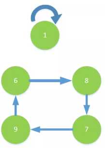 我们从元素1开始看,排序后元素1的位置还是1,那么就给1到1之间连一条边,形成一个自环;再到元素8,元素8排序以后到了第4个位置,而第四个位置是元素7,所以给8到7之间连一条有向边,同理连完剩下的边可以得到一张图: