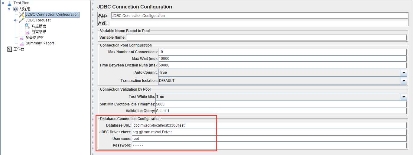 3.jdbc配置。右击线程组-->添加-->配置元件-->JDBC Connection Configuration(一般情况下只需要填写最后4行)